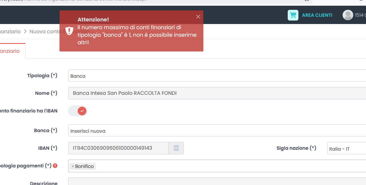 Buongiorno, sto provando il vostro prodotto con la versione base. Come associazione abbiamo, oltre alla cassa due conti bancari. Dalla configurazione dei conti pero’ tentando di aggiungere il secondo ricevo un messaggio d’errore “il numero massimo di conti finanziari di tipologia “banca” è 1…”. Dipende dalla versione che sto usando? La premium ne fa gestire piu’ di uno? Grazie